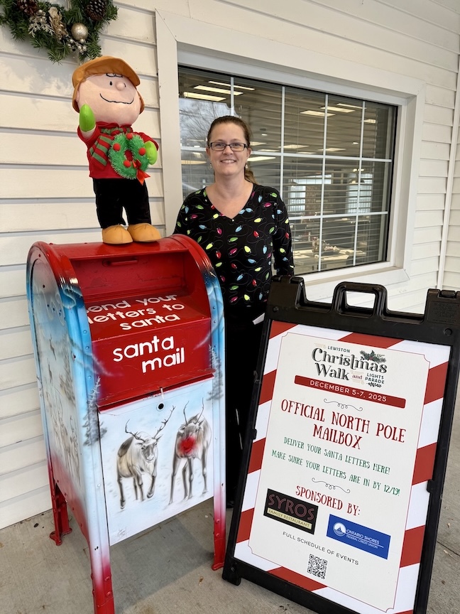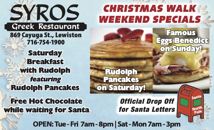 Drop off your “Letter to Santa” at the North Pole mailbox at Syros Restaurant, 869 Cayuga St., Lewiston. To receive a response from Jolly St. Nick, please make sure all letters are in by Dec. 19.