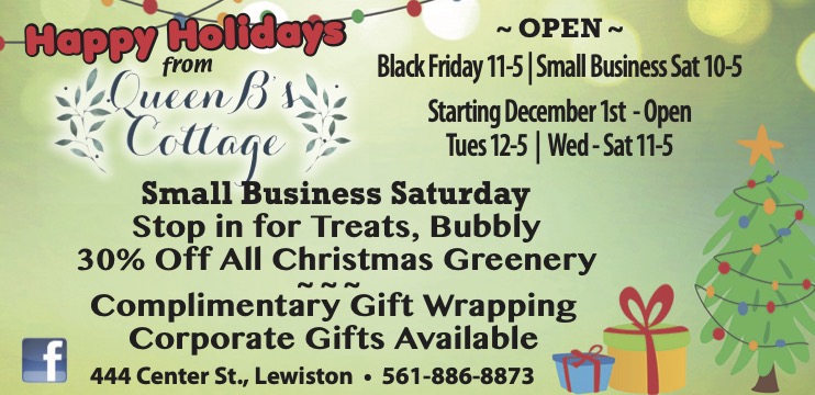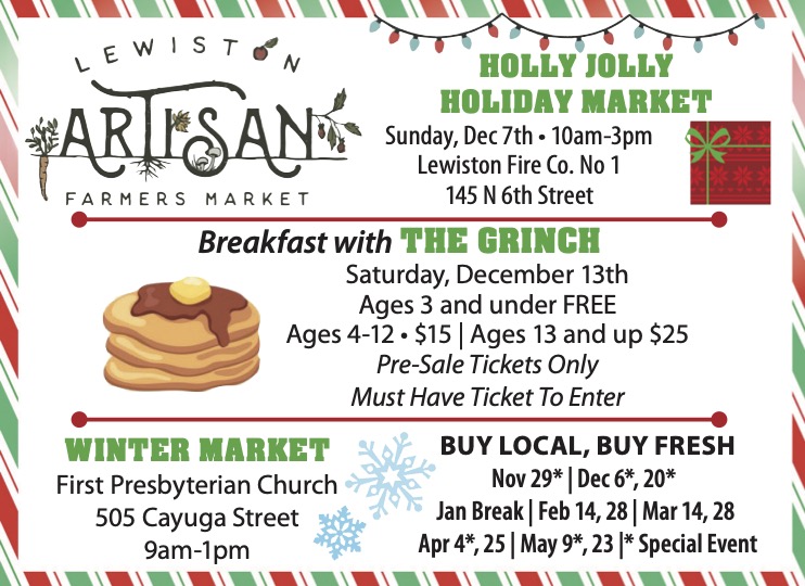 √ 10 a.m. to 3 p.m. – Lewiston Artisan Farmers Market “Holly Jolly Holiday Market” at Lewiston No. 1 Fire Co. firehall (145 S. Sixth St.). Vendor space is currently full. For more information, click here.