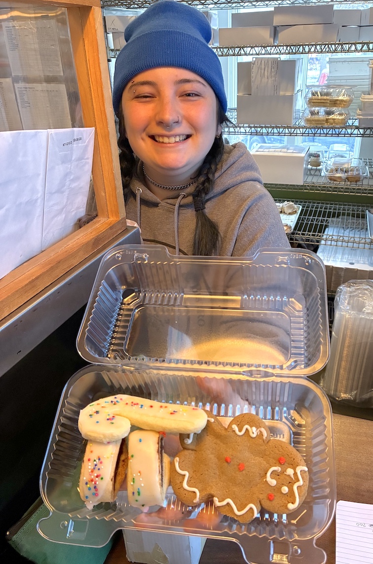 Pictured with holiday-themed, gluten-free baked goods at Kith & Kin is employee Cassidy Granchelli.