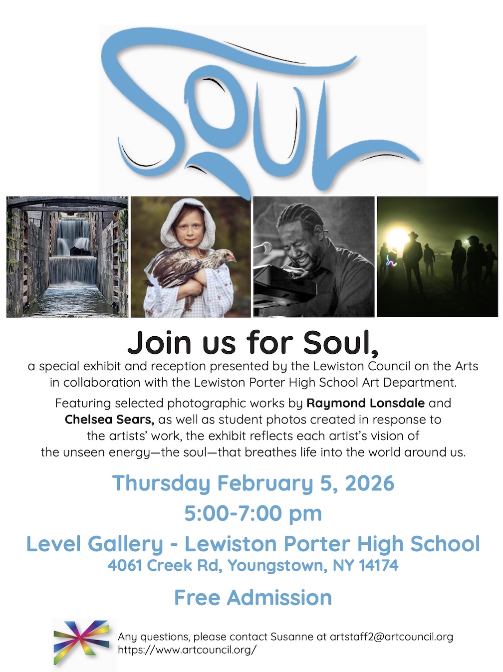 “We’re excited to invite the community to experience ‘SOUL’ in the Level Gallery at Lewiston-Porter, to spend time with the work of Ray Lonsdale, Chelsea Sears, and Lew-Port’s photography students, and to see the powerful connections that can grow when artists, educators, students and community come together,” Lewiston Council on the Arts Executive Director Maria Fortuna Dean said.