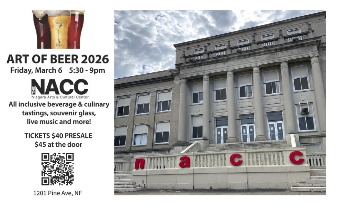 “Art of Beer,” the Niagara Arts & Cultural Center’s fundraiser, will take place from 5:30-9 p.m. Friday, March 6, at 1201 Pine Ave., Niagara Falls. The 21-and-older event includes beer, wine and cider tastings from local brewers; food from top Niagara Region restaurants; a commemorative beer glass; fine art; and live music on multiple stages – including headline performances by Cami Clune and Joshua Vacanti.