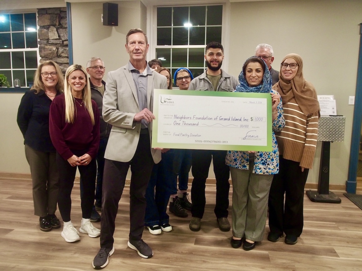 According to April Arman, a member of the mosque, “Muslims are currently celebrating the month of Ramadan. This time is particularly important for us, as this is a month of fasting. Fasting reminds us of what it is like to not have food and of how blessed we truly are in our daily lives. In addition, during this month, Muslims are required to donate a certain percentage of their discretionary income, which is then distributed to those in need. With this in mind, we wanted to donate to the Neighbors Foundation. With the help of a generous donor who matched the $500 raised dollar-for-dollar, we are thrilled to gift $1,000 to the Neighbors Foundation for use within our local Grand Island community.”