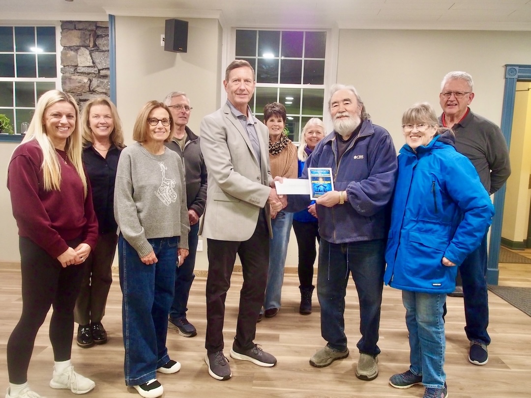 Faisal Tahiri, Dr. Semira Khawar and April Arman present a $1,000 donation to the Neighbors Foundation and its president, Dave Conboy, who is standing with a group of foundation volunteers.