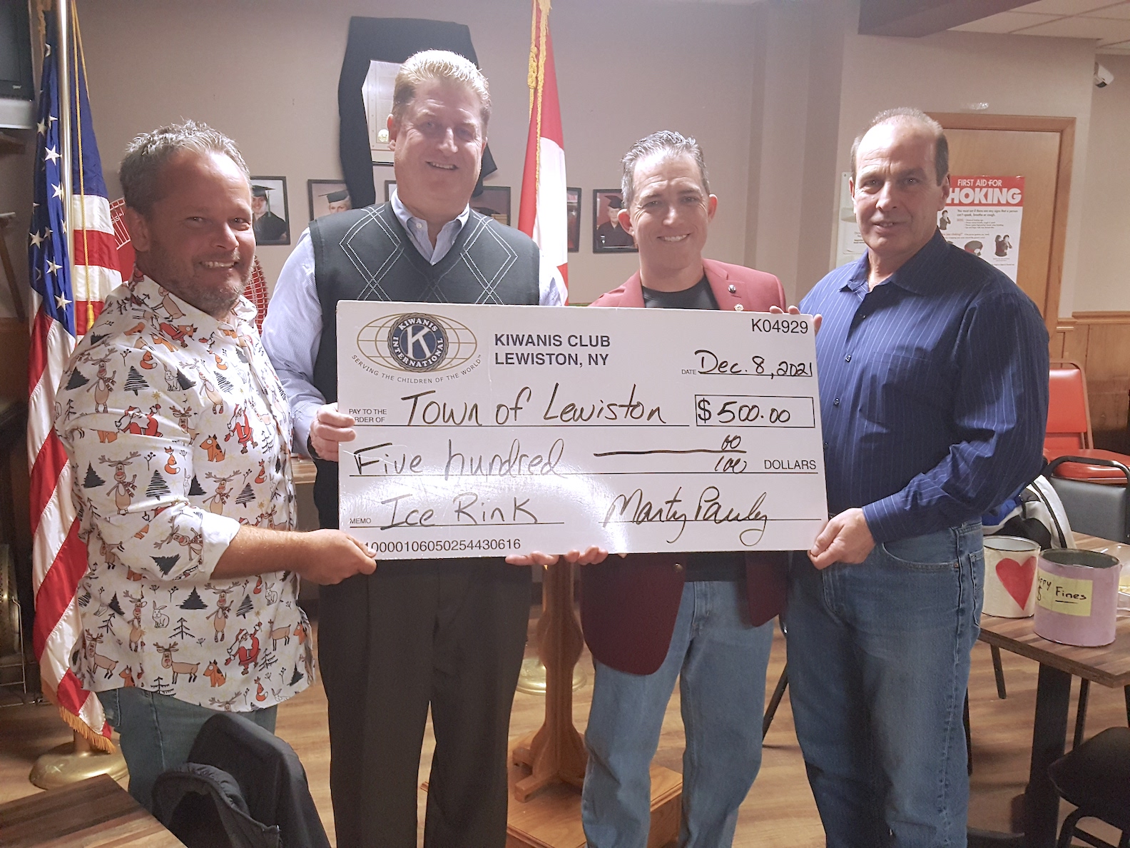 At a recent meeting of the Kiwanis Club of Lewiston, the club recognized the town's teamwork that has helped make the Lewiston Family Ice Rink the success story it has become. As a token of appreciation, club members presented a $500 check to the town to benefit the Academy Park attraction.