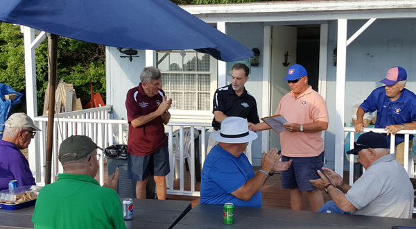 Paul J. Casseri, center, Lewiston-Porter superintendent of schools, is greeted Wednesday as the newest member of the Kiwanis Club of Lewiston.