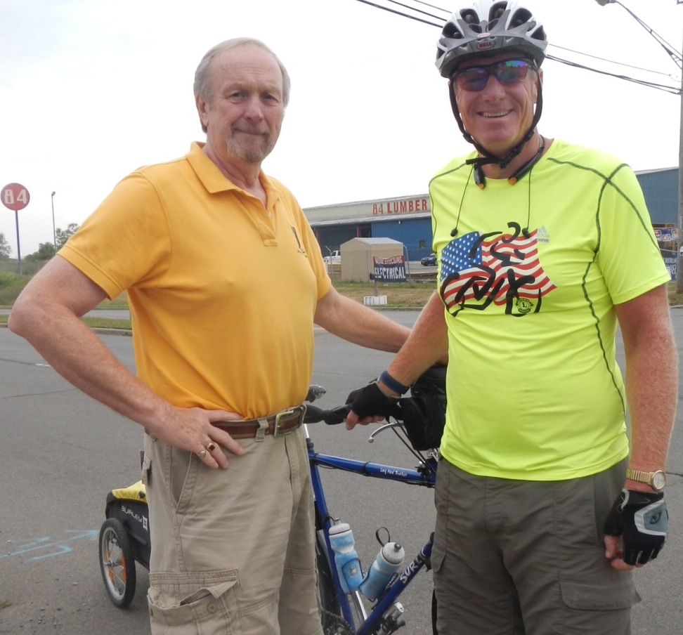 Lion Mark Mansell (right), a member of La Center, Wash., Lions Club, is on a 3,500-mile mile bicycle tour from Portland, Ore., to Portland, Maine, to increase awareness and raise funds for leader dogs for the blind.