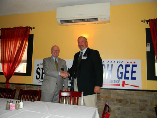Town of Lewiston justices the Hon. Thomas J. Sheeran (left) and Hon. Hugh C. Gee Sr. are shown at their campaign kick-off May 23 at The Brickyard Pub & BBQ in Lewiston.