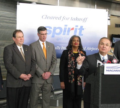 Niagara Falls International Airport's third low-cost airline, the Florida-based Spirit Airlines, sent its first planeload of Western New York and Canadian residents to Fort Lauderdale at 1:55 a.m. Friday.