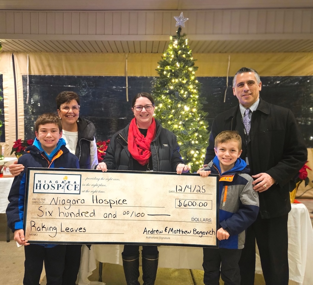 Two young boys from Lewiston recently raised $600 for Niagara Hospice in memory of their grandmother. Andrew and Matthew Bagovich went door to door asking neighbors if they needed their leaves raked, and ended up taking care of about 10 yards. Several generous neighbors also made additional donations to support Niagara Hospice.