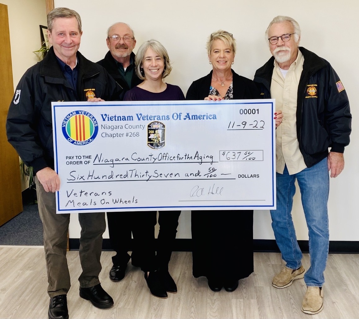 The Vietnam Veterans of America Chapter No. 268, based in Lockport, delivered a check to the Niagara County Office for the Aging (OFA) to cover the cost of meals on Veterans Day for all the veterans enrolled in the county's home-delivered meals program. There are nearly 90 veterans enrolled in the meal program.