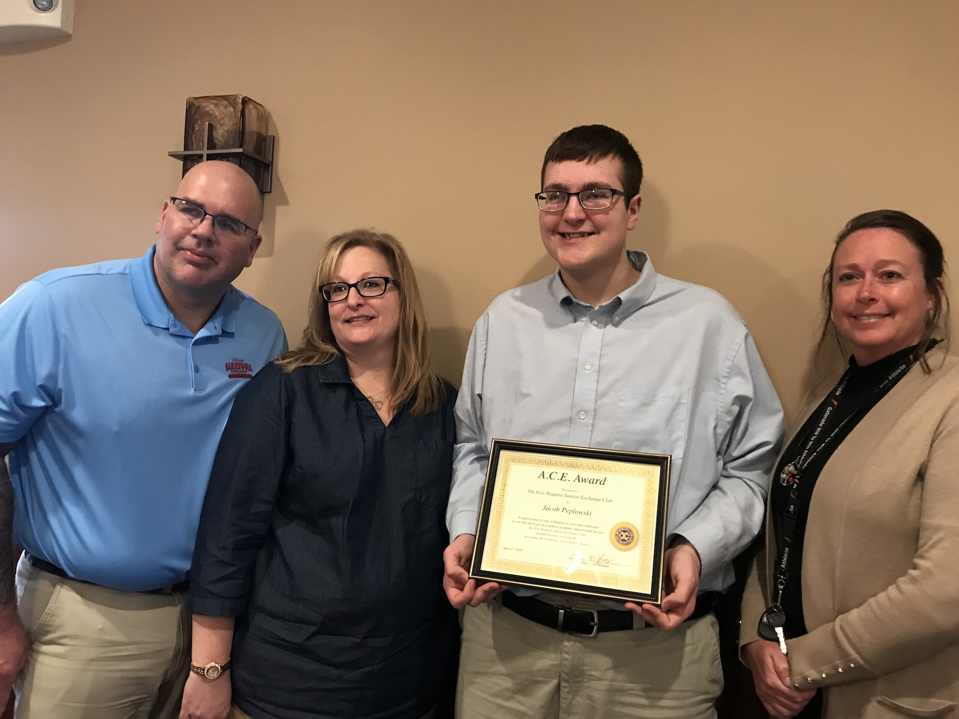On April 17, Jacob Peplowski, a senior at Niagara-Wheatfield High School was honored at the Erie-Niagara Sunrise Exchange Club meeting.