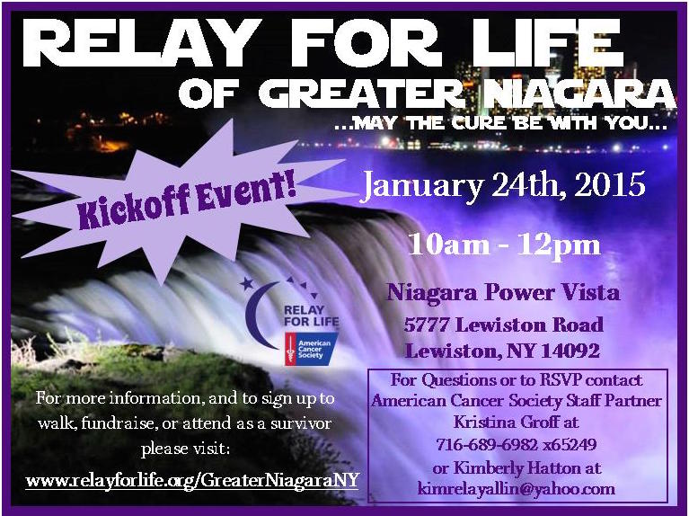 Organizers of the American Cancer Society's all-new Relay For Life of Greater Niagara will hold a kickoff event Saturday to announce this year's event. It will take place from 10 a.m. to noon Jan. 24 at the Niagara Power Vista's Community Room, 5777 Lewiston Road.