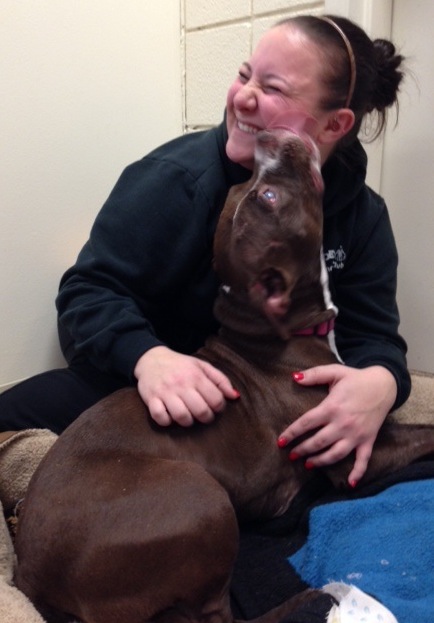 DeeDee, a chocolate brown pit bull mix with white markings, was rescued Dec. 2 by Lauren Zaninovich, SPCA supervisor for adoptions/admissions, who also works as the cruelty dispatcher and a rescue driver.