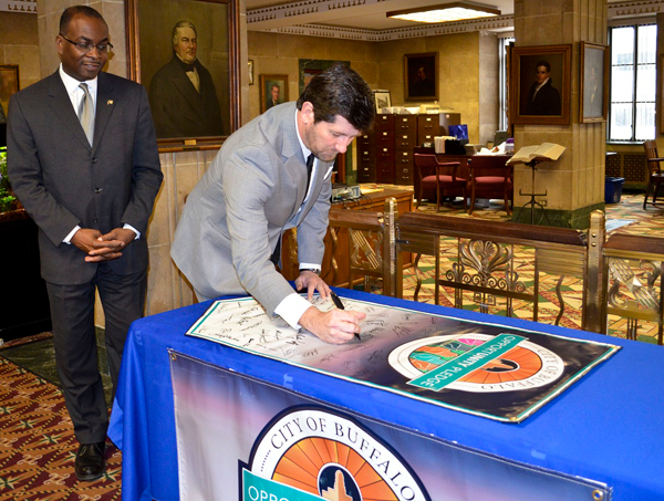 Erie County Executive Mark C. Poloncarz, along with numerous county commissioners and employees, today joined Buffalo Mayor Byron Brown to affix his signature to Buffalo's Opportunity Pledge.