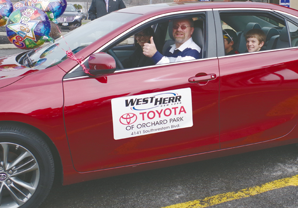Tim Hortons Cafe & Bake Shop presented R.J. Wynne of Grand Island with the grand prize of a new car in the RRRoll Up the Rim to Win contest Friday.