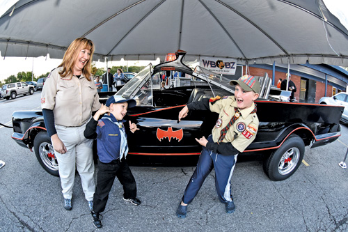 Colleen Huff and her two sons Raistlin Huff, 10, and Perrin Huff, 8, of Cub Scout Pack 630 from Grand Island enjoy the Batmobile, which made a visit to Say Cheese Pizza Company and Comic Book Cafe on Grand Island.