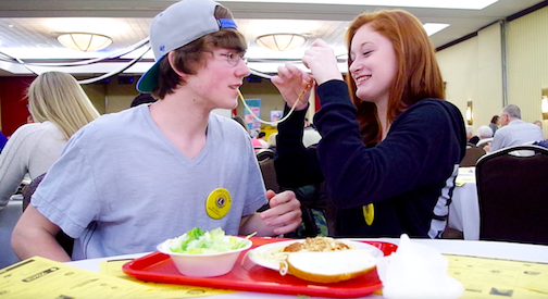 Olivia Goc and Ryan O'Neil recreate the famous spaghetti noodle scene from the Disney animated movie "Lady and the Tramp" during Monday's Lions Spaghetti Dinner.