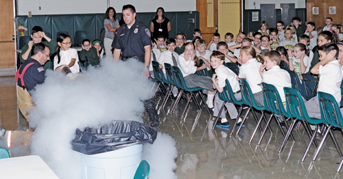 Grand Island Fire Co. Lt. Tom Dewey and firefighter Chuck Piccone, with the help of a volunteer, teach students at St. Stephen School how to use a fire extinguisher during a fire prevention assembly.