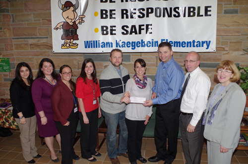 Fundraising efforts to build a new playground at Kaegebein Elementary School received a hand from a neighboring business. Kevin Slachciak, owner of Say Cheese Pizza Company, located just up Love Road from Kaegebein Elementary, presented the Kaegebein Playground Committee with a check for $750.
