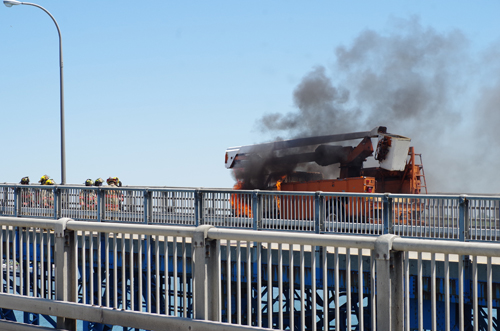 VIDEO: A utility truck caught fire in the right lane of the northbound North Grand Island Bridge Tuesday morning.