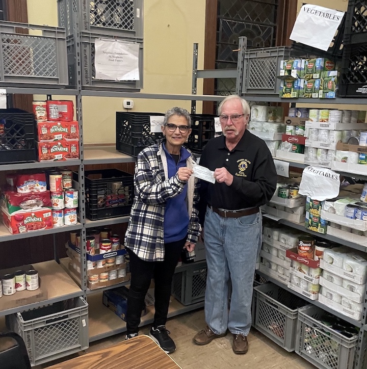 The Grand Island Neighbors Foundation was the grateful recipient of $500 from the Grand Island Lions Club. Pictured, from left: Neighbors Foundation board member Annie Carlson and Tom Rusert of the Grand Island Lions Club.