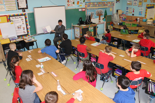 Erie County Executive Mark Poloncarz reads "The Rainbow Fish" to students in Tricia McDonald's fourth-grade class Monday during the Parents As Reading Partners program at Kaegebein Elementary School. (photo by Larry Austin)