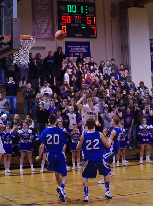The anxiety is etched on the faces of spectators in the Hamburg student section as they watch Tom Lipomi's last-second jump shot make its way to the hoop during last Wednesday's Section VI Class A-1 boys basketball playoff game at Hamburg High School.