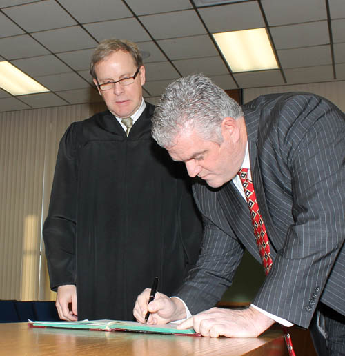 Newly appointed Grand Island Councilman Chris Aronica signs paperwork after taking his oath of office from Grand Island Town Justice Mark Frentzel.