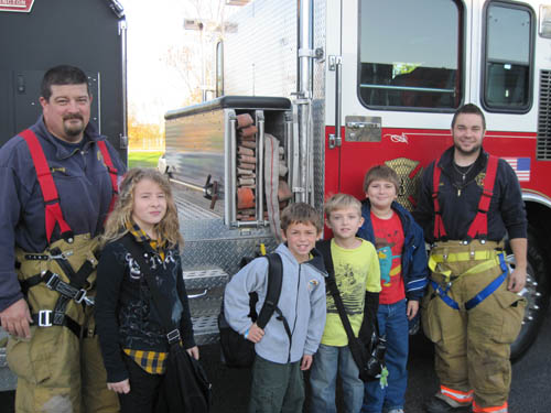 Eight very enthused Kaegebein students had an unusual but exciting ride to school on Monday, Oct. 17. They were picked up and driven to school in Grand Island Fire Co. trucks.