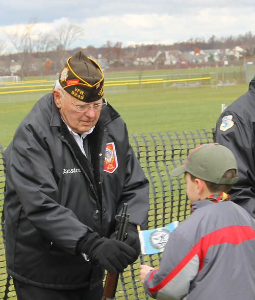 Kester Bleich of Grand Island receives a flag from a Boy Scout during Friday's Veterans Day ceremony at the Veterans Memorial Wall on Bedell Road.