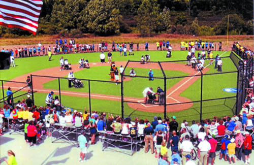 Hundreds of spectators, volunteers and players turned out for the very first ball game played at the Sabres Miracle League Field in Veterans Park Tuesday.
