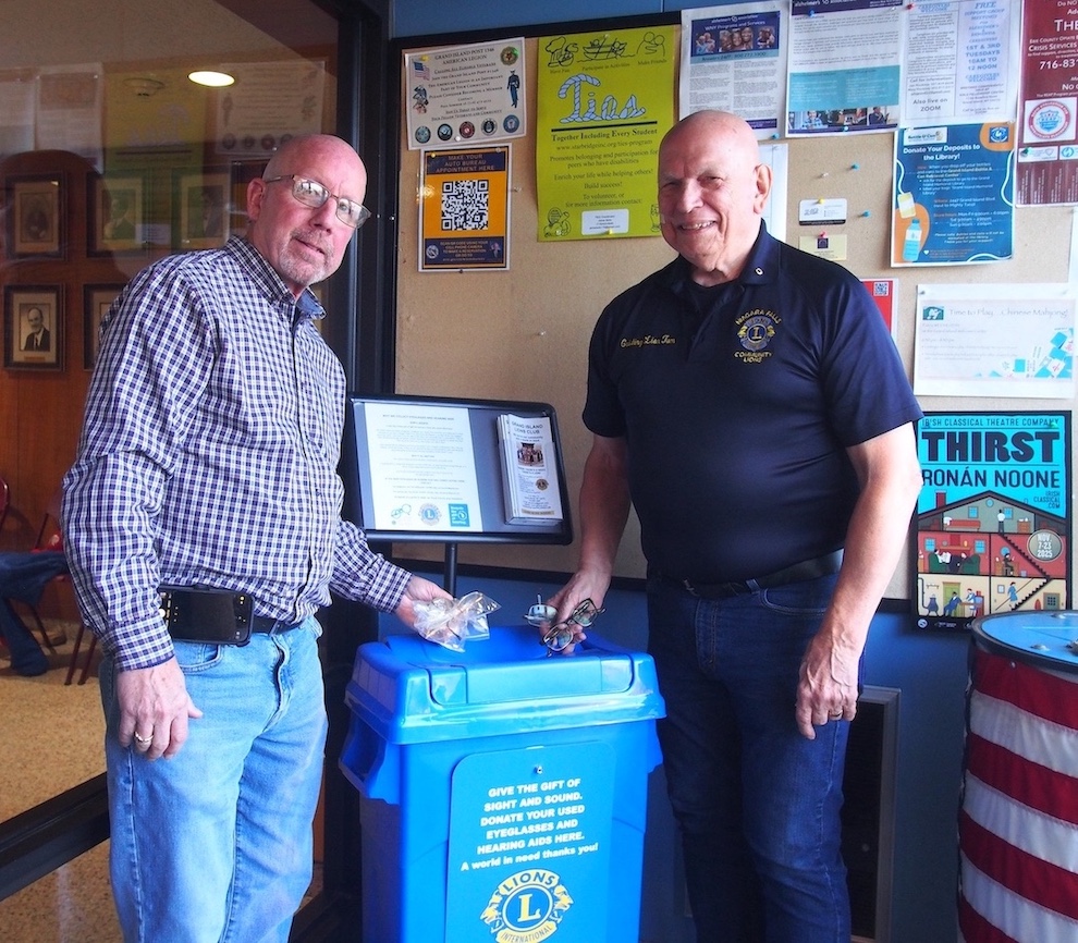 The Grand Island Lions are proud to present their new eyeglass and hearing aid collection receptacle in the Town Hall. Lions Dick Crawford and Tom Witkowski are shown depositing used items generously donated by citizens who know that, where there's a need, there's a Lion.