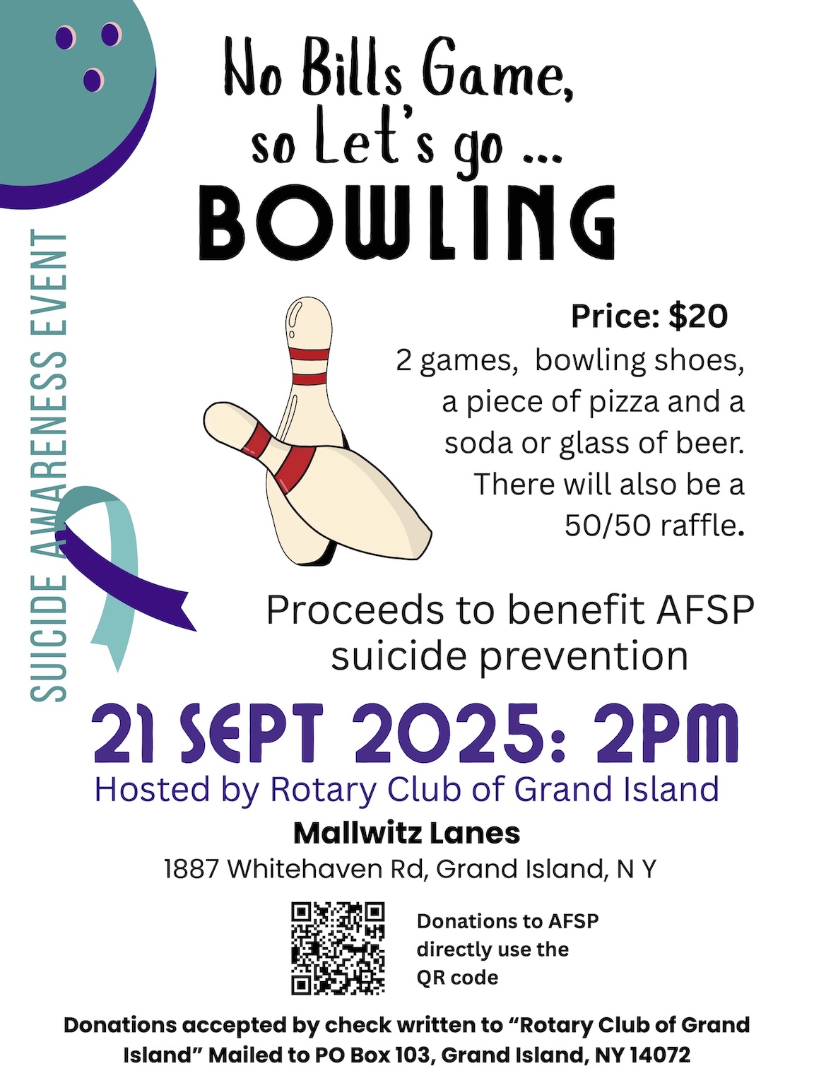 Concerned about the prevalence of suicide and its impact on this community, the Rotary Club of Grand Island and Mallwitz's Island Lanes are taking advantage of a Sunday without a Buffalo Bills game to promote suicide awareness during an afternoon of bowling.
