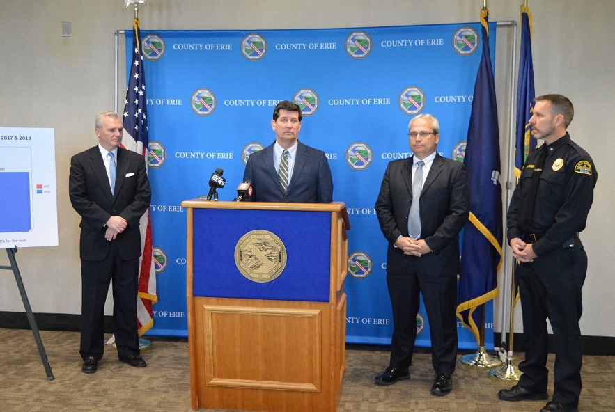 Erie County Executive Mark C. Poloncarz was joined Tuesday by Erie County Legislature Chairman Peter Savage (3rd District), Legislature Majority Leader April Baskin (2nd District) and Legislator Barbara Miller-Williams (1st District) to present highlights of the recently adopted 2019 Erie County budget, which was passed by the legislature last week in an 8-3 vote.
