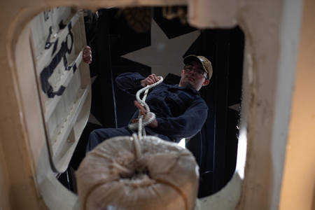 U.S. Navy Boatswain's Mate Seaman Daniel Cordner of Buffalo heaves around a bale of line in the fo'c'sle aboard the aircraft carrier USS John C. Stennis (CVN 74) in Norfolk, Virginia. The John C. Stennis is conducting routine operations in support of Commander, Naval Air Force Atlantic.