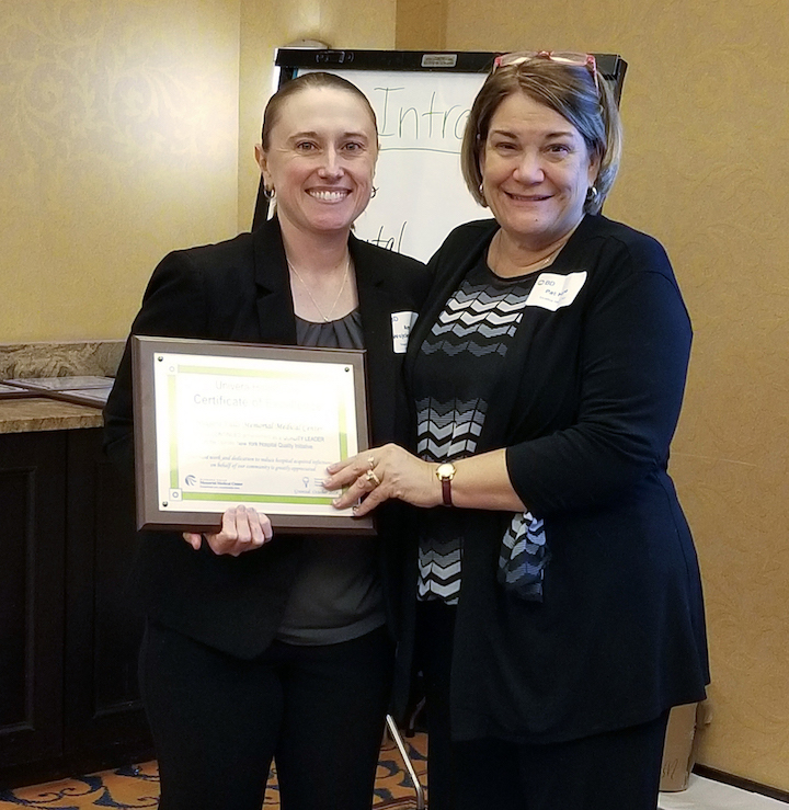 Amy Wojciechowski, left, infection prevention and antimicrobial stewardship coordinator at Niagara Falls Memorial Medical Center, received the Excellus BlueCross/BlueShield Quality Leaders Award from Excellus Provider Performance Improvement Manager Patricia Hope at the recently held Upstate New York Hospital Quality Initiative (UNYHQI) Best Practices Summit in Verona.