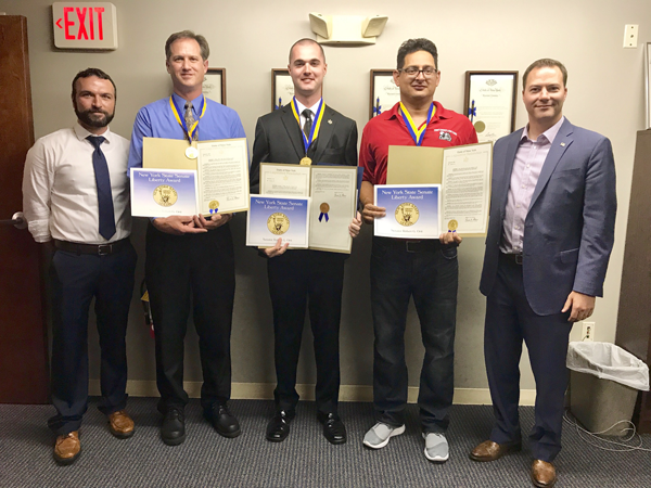 New York State Sen. Rob Ortt presented New York State Senate Liberty Medals to three individuals who rescued a man from his fiery car in the Town of Pendleton last November.