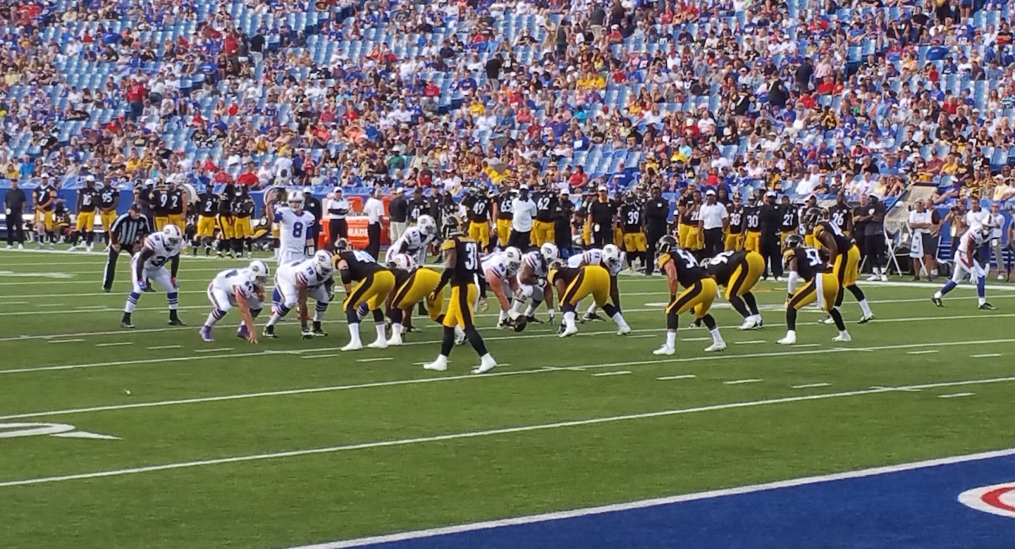 Three of Buffalo's four quarterbacks threw touchdown passes Saturday, including Matt Simms (No. 8), as the Bills routed the Pittsburgh Steelers 43-19 at Ralph Wilson Stadium in Orchard Park. (Photo by Matt Duffy)