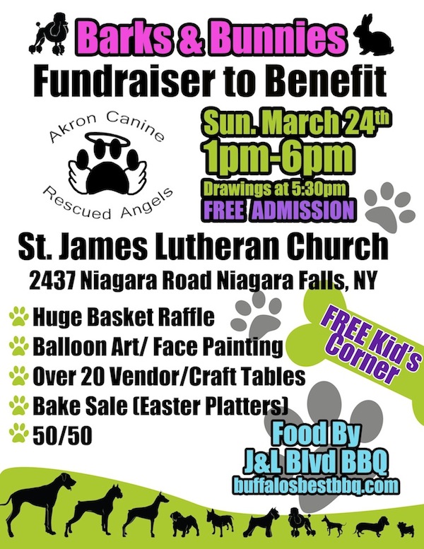St. James Church will be the site of a fundraiser for Akron Canine Rescued Angels. The event, featuring a basket raffle with 100-plus items, will take place from 1 to 6 p.m. on Sunday, March 24.
