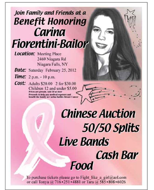 A benefit to help Carina Fiorentini-Bailor offset some of the expenses associated with her cancer treatment will be held Saturday, Feb. 25, from 2 to 10 p.m. at the Meeting Place, 2469 Niagara Road Niagara Falls.