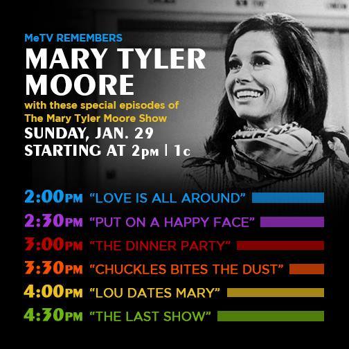 WBBZ-TV, "Your Hometown MeTV Station," pays tribute to the career and comedy of trailblazer and TV icon Mary Tyler Moore with a special collection of "Mary Tyler Moore" episodes airing from 2-5 p.m. Sunday, Jan. 29.