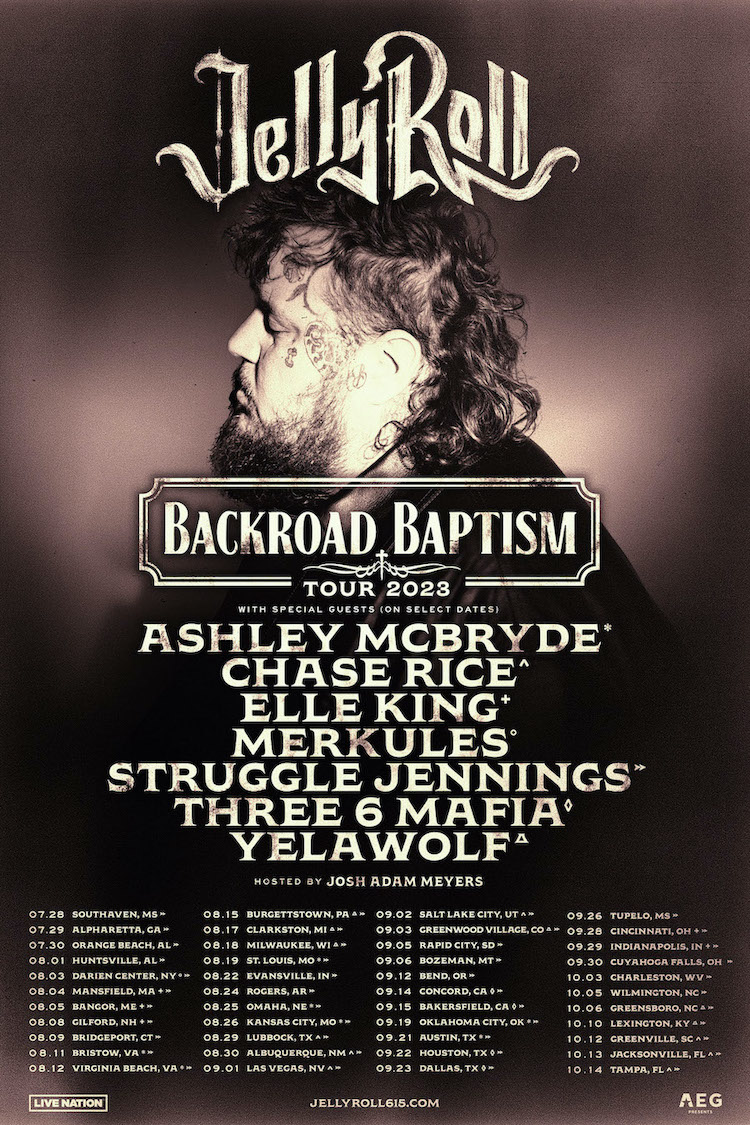 After dominating Billboard's Emerging Artist Chart for a record-breaking 25 consecutive weeks - ultimately breaking the record of most weeks spent at No. 1 - with his single, "Son Of A Sinner," multigenre hitmaker Jelly Roll today announced his "Backroad Baptism Tour."