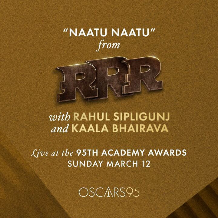 The Oscar-nominated song "Naatu Naatu" from "RRR" will be performed at the 95th Oscars, executive producers and showrunners Glenn Weiss and Ricky Kirshner and executive producer Molly McNearney announced. Hosted by Jimmy Kimmel, the 95th Oscars will air live on ABC and broadcast outlets worldwide on Sunday, March 12.
