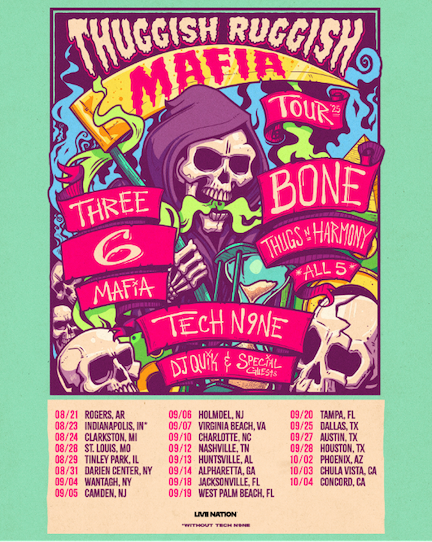 Hip-hop groups Bone Thugs-N-Harmony and Three 6 Mafia have announced their co-headline tour, "The Thuggish-Ruggish-Mafia-Tour." Produced by Live Nation, the 24-city tour includes a stop at Darien Lake Amphitheater on Aug. 31.