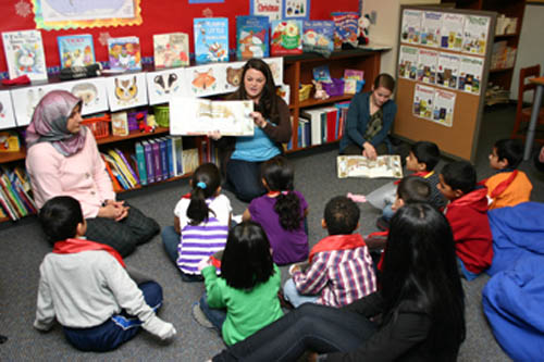 Chelsea Riedl, a 2010 Niagara University graduate currently pursuing a master's degree in literacy instruction, reads to ESL (English as a Second Language) students from Geraldine J. Mann Elementary School in Niagara Falls.