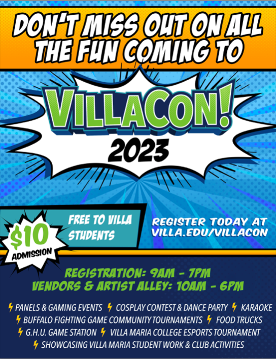For the second consecutive year, Villa Maria College will host "VillaCon," a one-day convention featuring gaming, cosplay, animation, film, vendors and artists. This year's con will take place from 9 a.m. to 9 p.m. Saturday, March 25, on Villa Maria's campus, located at 240 Pine Ridge Road, Buffalo. Last year's inaugural event drew more than 500 people from across Western New York, and the college expects this year's event to attract even more people.