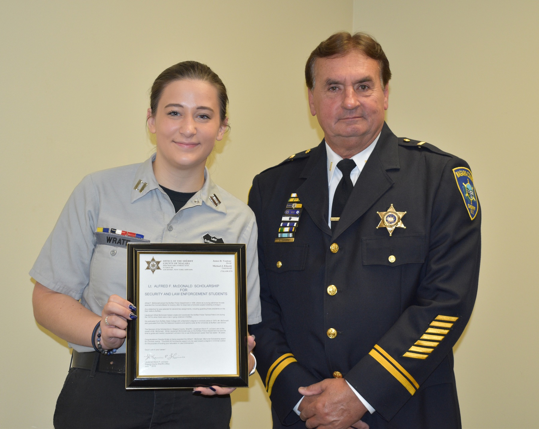 Claudia Wrate, a student in the security and law enforcement program at the Niagara Career and Technical Education Center received a scholarship at closing ceremonies recently