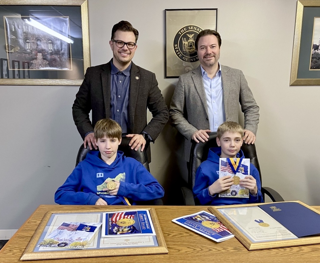 On Friday, New York State Sen. Rob Ortt presented the New York State Senate Liberty Medal to Newfane Central School District students Liam Hedley and Hunter Marcello, whose quick actions saved a woman and her dog from drowning over the summer in Olcott.