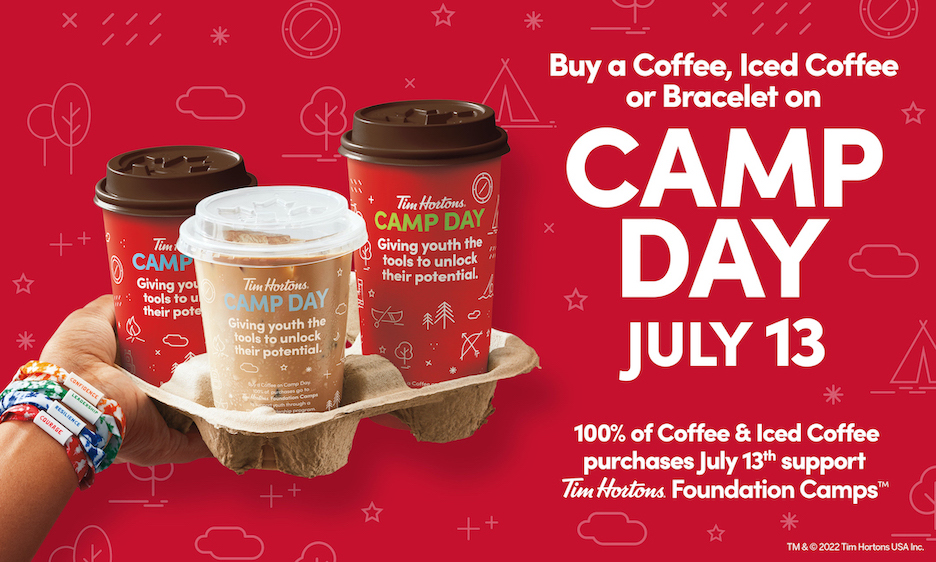 Tim Hortons announced its 31st annual Camp Day fundraising campaign returns Wednesday, July 13, when 100% of purchases from all hot coffee and iced coffee sales in the U.S. and Canada will be donated to Tim Hortons Foundation Camps to support sending youth from underserved communities to Tims Camps.