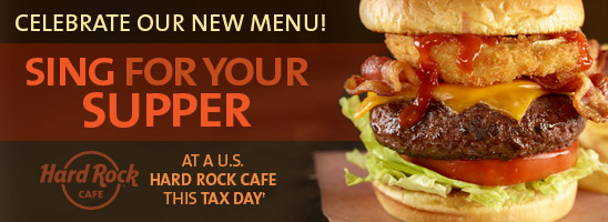 This year, on Tax Day, Hard Rock Café is cutting Americans a break by asking them to lay down their wallets and pick up the mic. On Tuesday, April 15, Hard Rock Café, Niagara Falls, USA, opens up its stage to give fans a chance to "Sing for Your Supper."